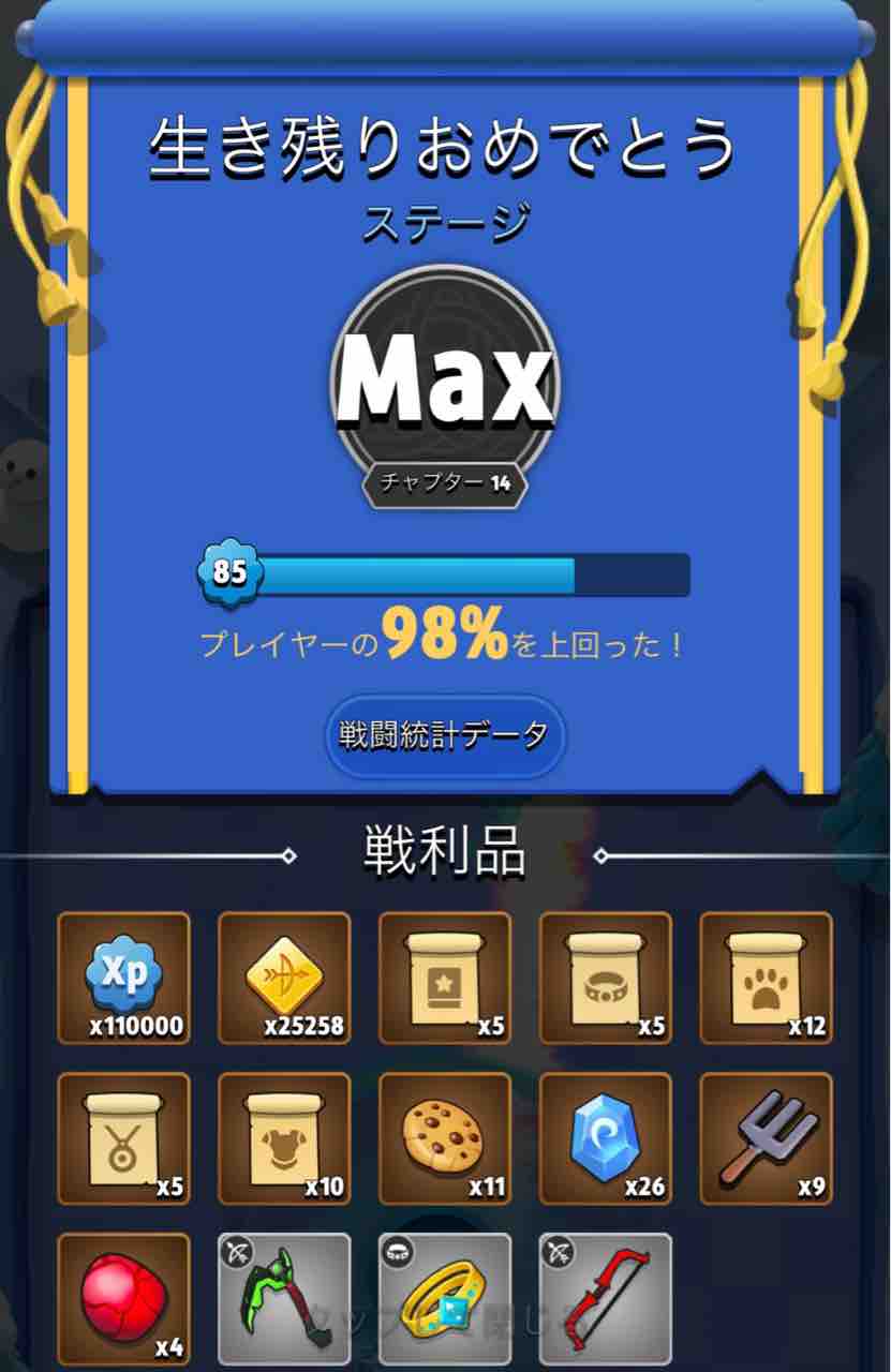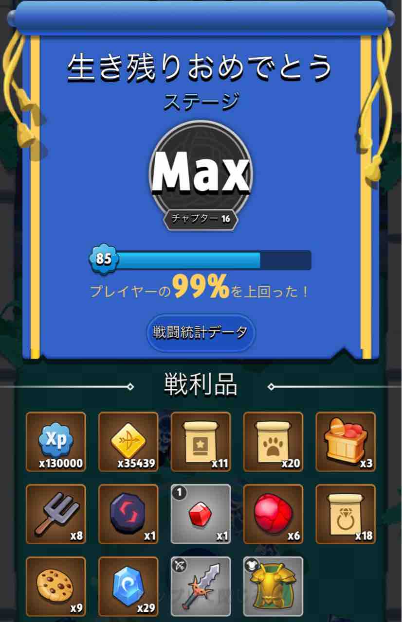 倒す敵が多い方が報酬は美味しいようですが、スタミナを余らせるのが何よりのタブーなので、時間がない時は短めのチャプターを周回しましょう。