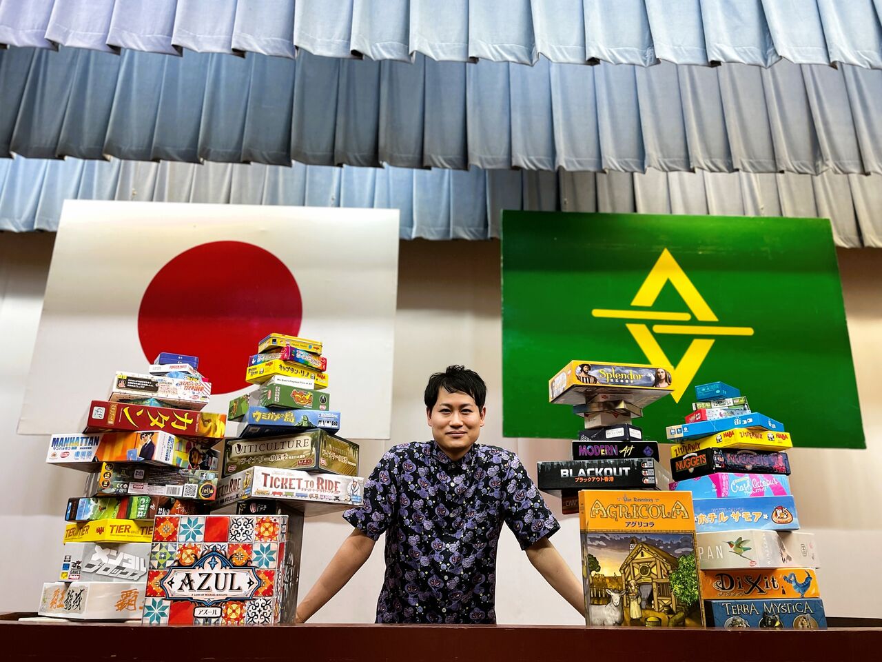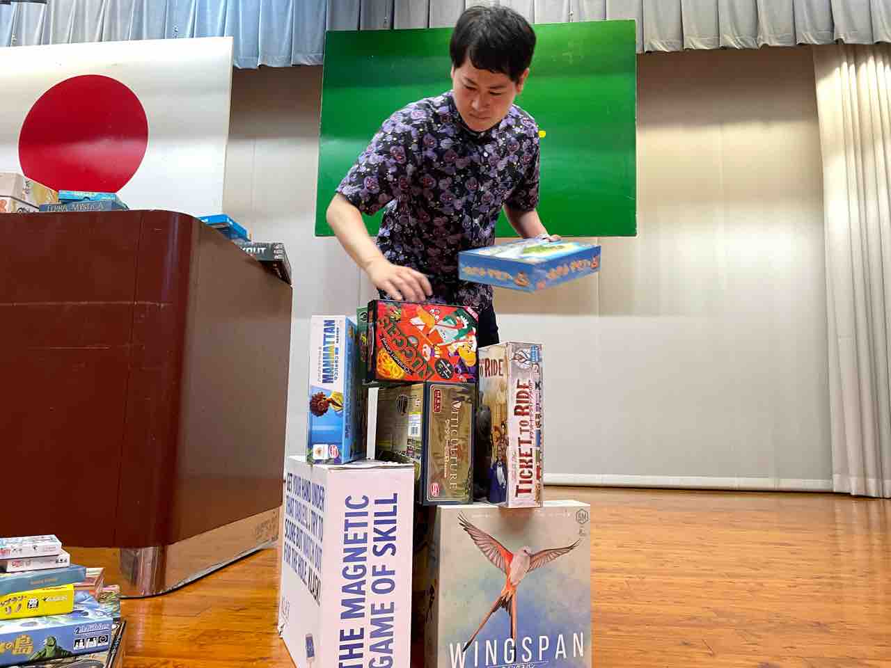 ボードゲームの箱はだいたい四角いので積み上げやすいですね。大人が集中して作業しているので崩れることもありません。