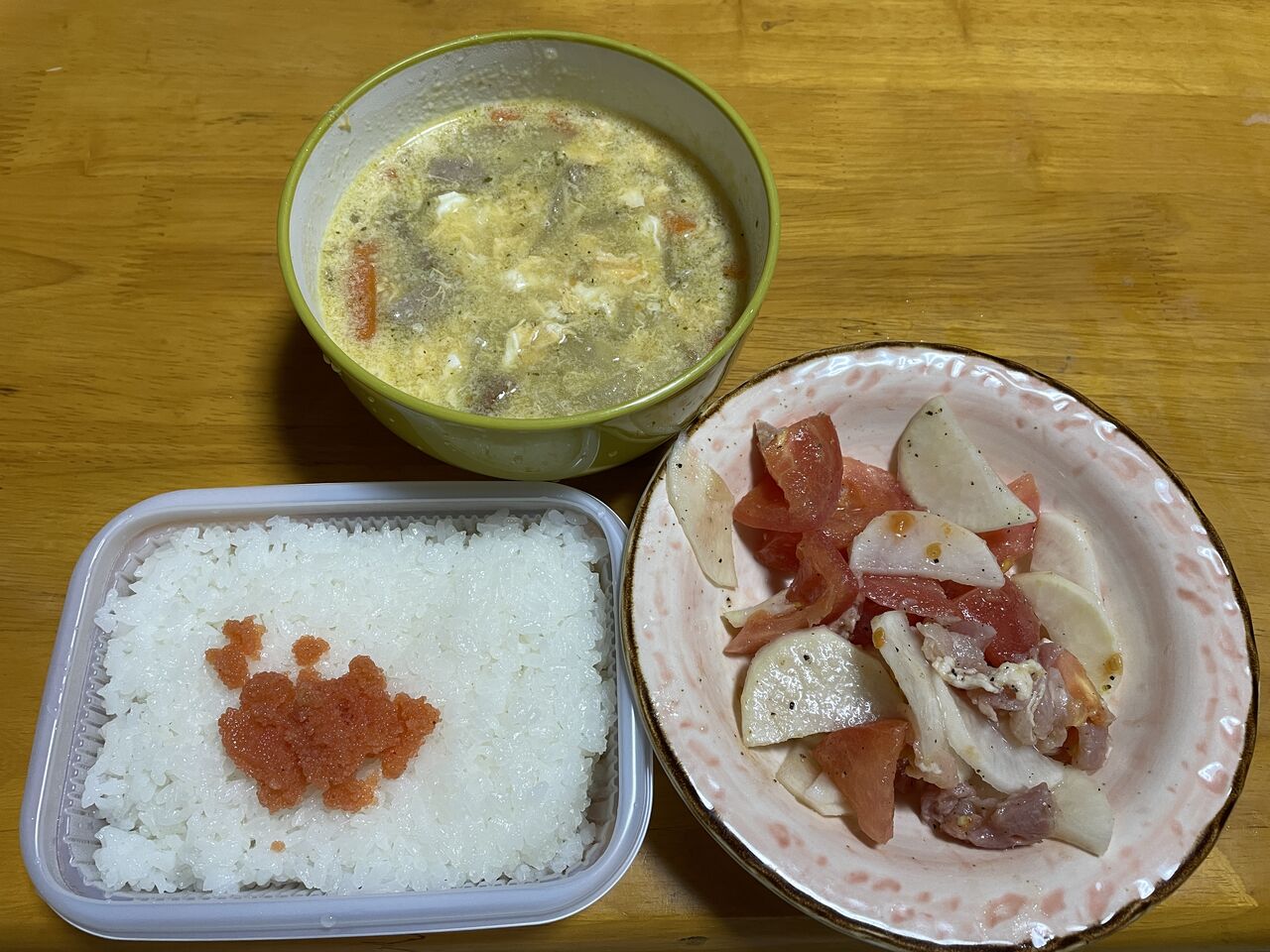 夜:ご飯、明太子、コンソメスープ、大根と生ハムのマリネ、焼き鯖