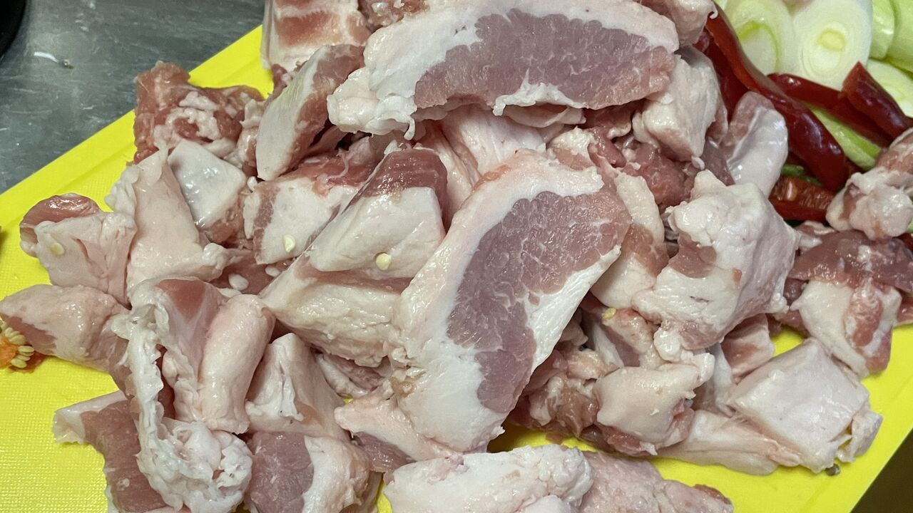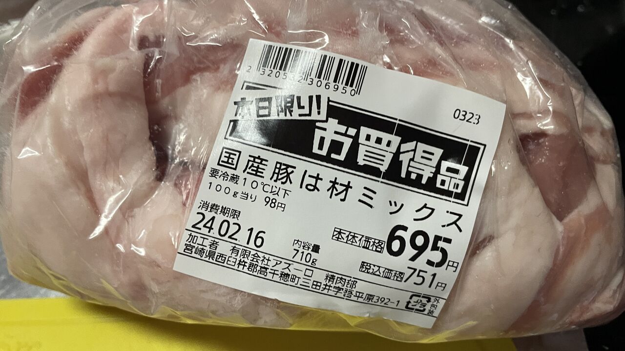 「ぶた・は材」という、コマ肉よりさらに雑な感じの、ブロックのかけらがあったりクズ肉がまとめられているやつを買いました。