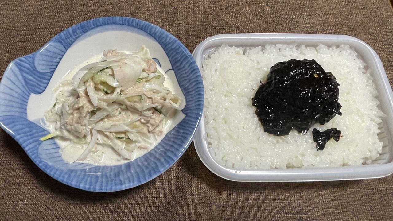 昨日作ったサラダと米、海苔の佃煮