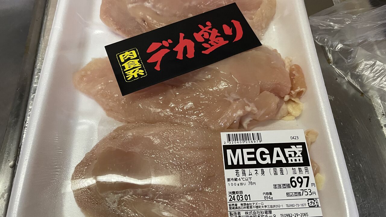 皮付きの鶏むね3枚、100gあたり78円です。これならまあ買ってもいいでしょう。