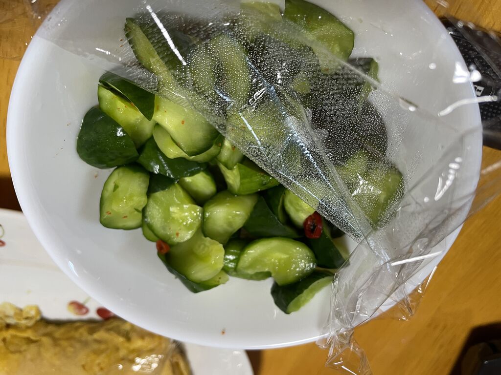 朝はキュウリのビール漬けです。甘めの味付けでご飯が進むんですよ。