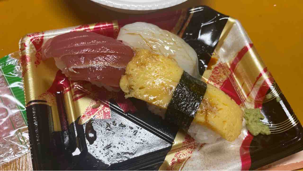 パック寿司なんかつまんでね。